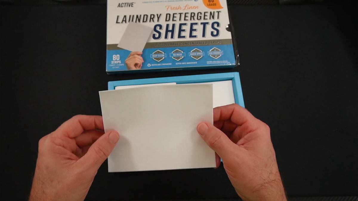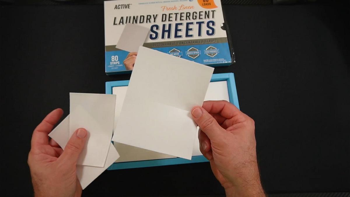 Each “sheet” is actually two perforated strips. One full sheet — meaning both strips together — is designed for a normal load. You can tear it in half for smaller loads or delicates, or use two full sheets for a particularly dirty load.