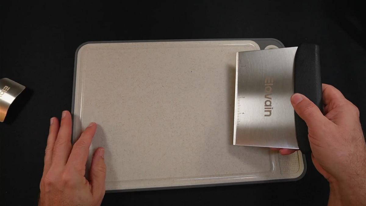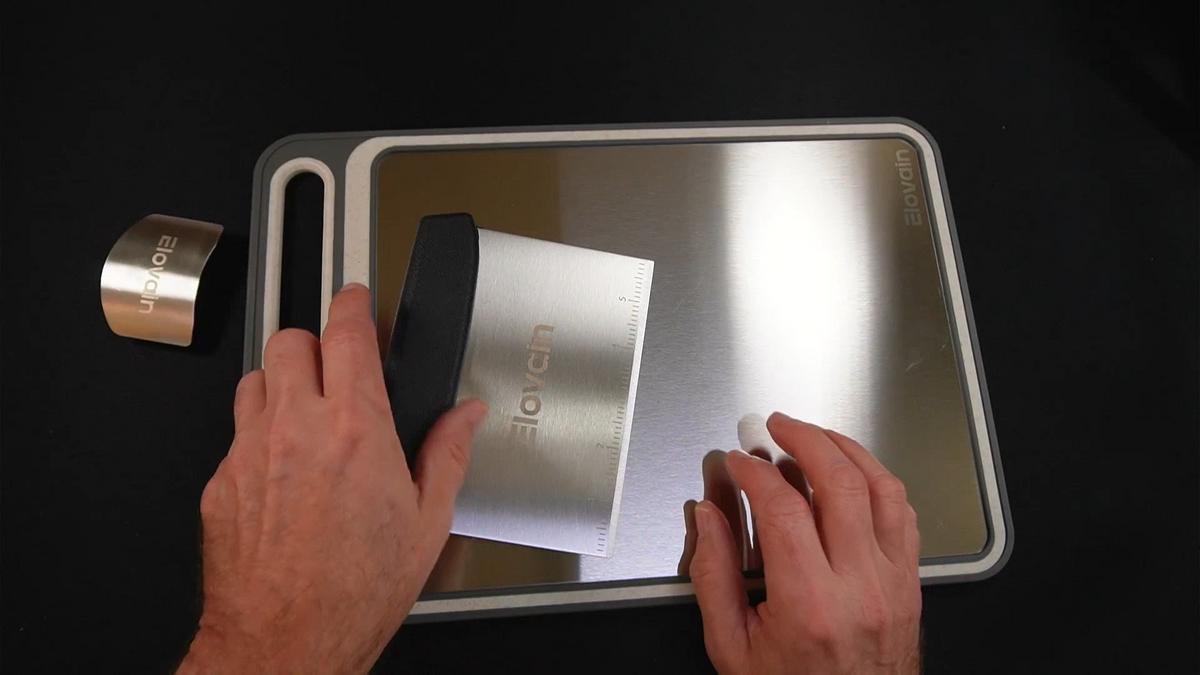 When I evaluated this product, I noticed right away that the bench scraper is not a throwaway accessory. In the video, you can see that it is built from the same 304 stainless steel as the board itself. It does not flex or bend when you push against a pile of chopped vegetables. I make sourdough bread, and this is a legit, full-size bench scraper that I would use in my own kitchen without hesitation.