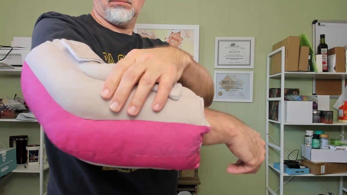 The pad wraps around the full elbow area, not just the tip. As I demonstrated in the video, that contoured shape matters when someone is lying on their side or pressing against an armrest at an angle, where the sides of the elbow take just as much pressure as the point.
