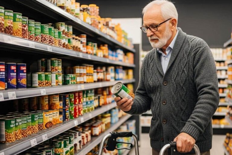 Older man using a walker in a grocery store aisle reading food label, full-body