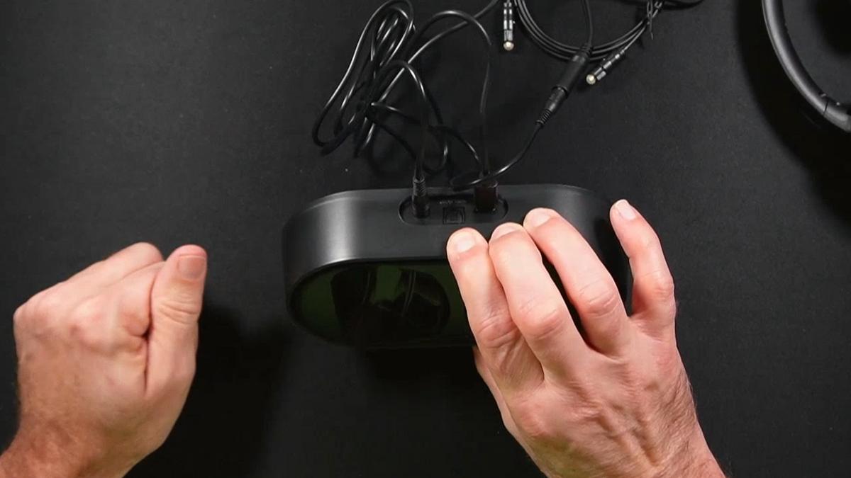 The transmitter charging base is a modest, unobtrusive unit that sits near your TV. It connects to your television with a single cable and doubles as both the signal transmitter and the headphone charger.